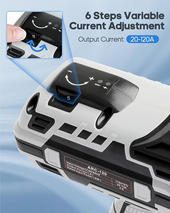 This 110V portable welding machine features 6 variable current adjustments and an IGBT inverter. Suitable for 1/16-1/8 welding rods.